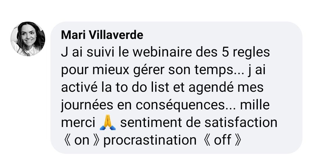 « J’ai besoin d’aide! J’ai une problématique de gestion du temps. Je suis très mal organisée et je perds beaucoup en productivité. Je pars dans tous les sens, mes journées et semaines ne sont pas structurées, j’ai besoin d’un cadre et d’une meilleure organisation pour mieux gérer mes dossiers ». 😕