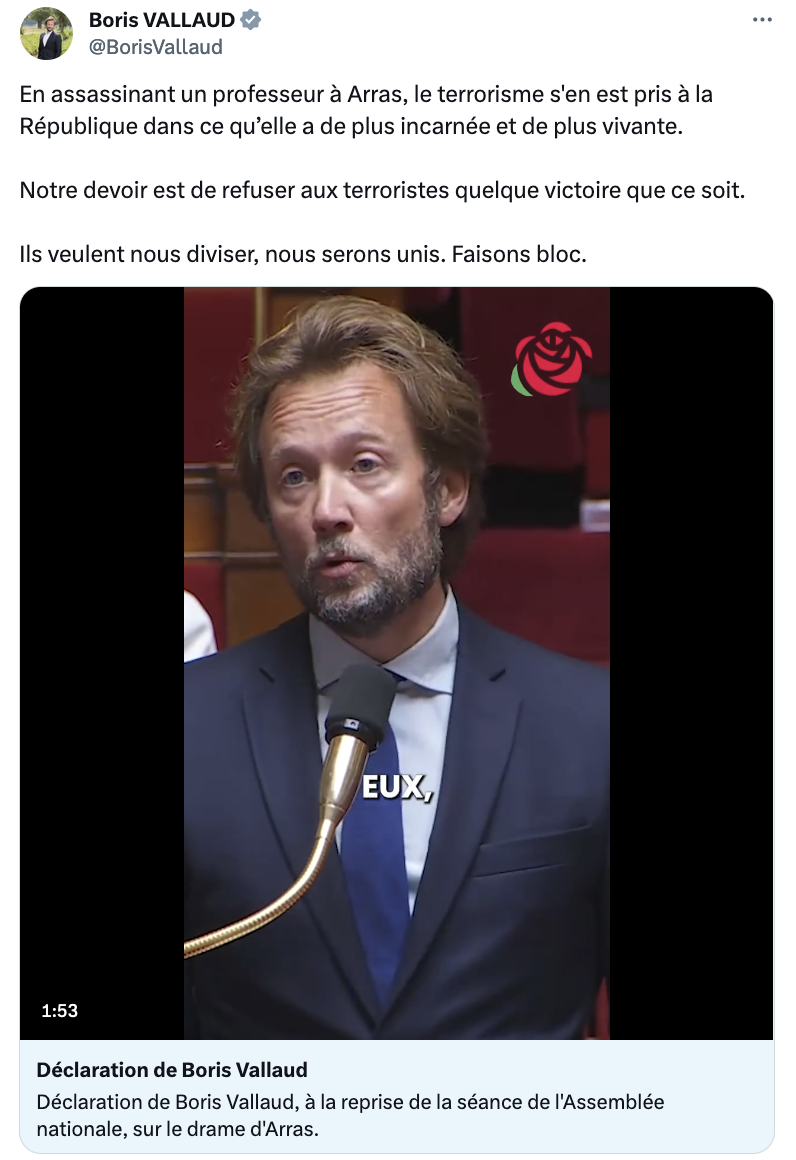 Le Parti socialiste exprime d’abord sa vive émotion suite à l’attaque terroriste d’Arras qui a coûté la vie à un enseignant.