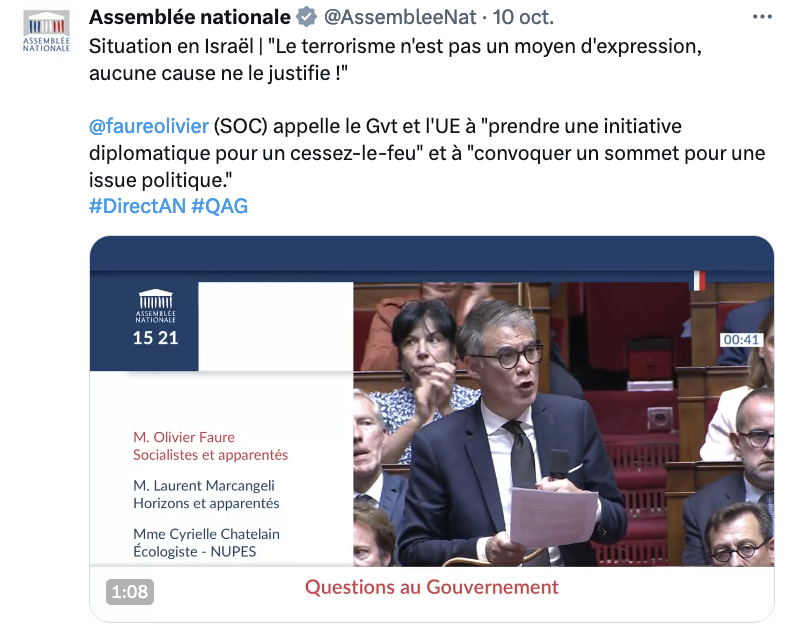 Mardi, à l’occasion de la séance de questions au gouvernement, Olivier Faure s’est exprimé dans l’hémicycle sur la situation en Israël.