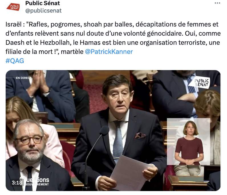 Mercredi, c’était la séance de questions au gouvernement au Sénat. Patrick Kanner a pris la parole à son tour sur la situation en Israël au nom du groupe socialiste, écologiste et républicain.