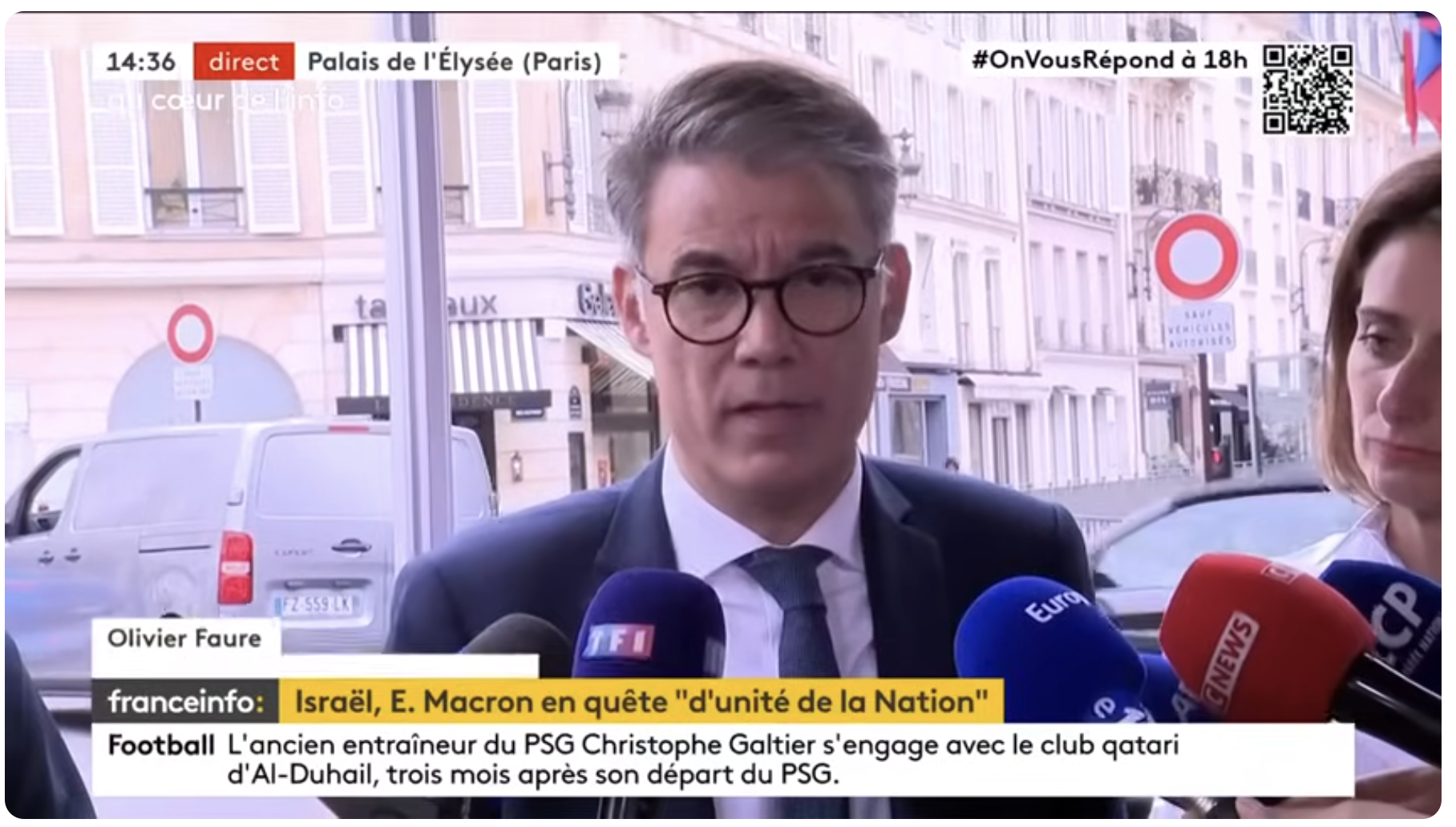 Hier, les chef·fe·s de partis étaient reçu·e·s par Emmanuel Macron pour évoquer la situation « à la suite des actes terroristes commis en Israël ».