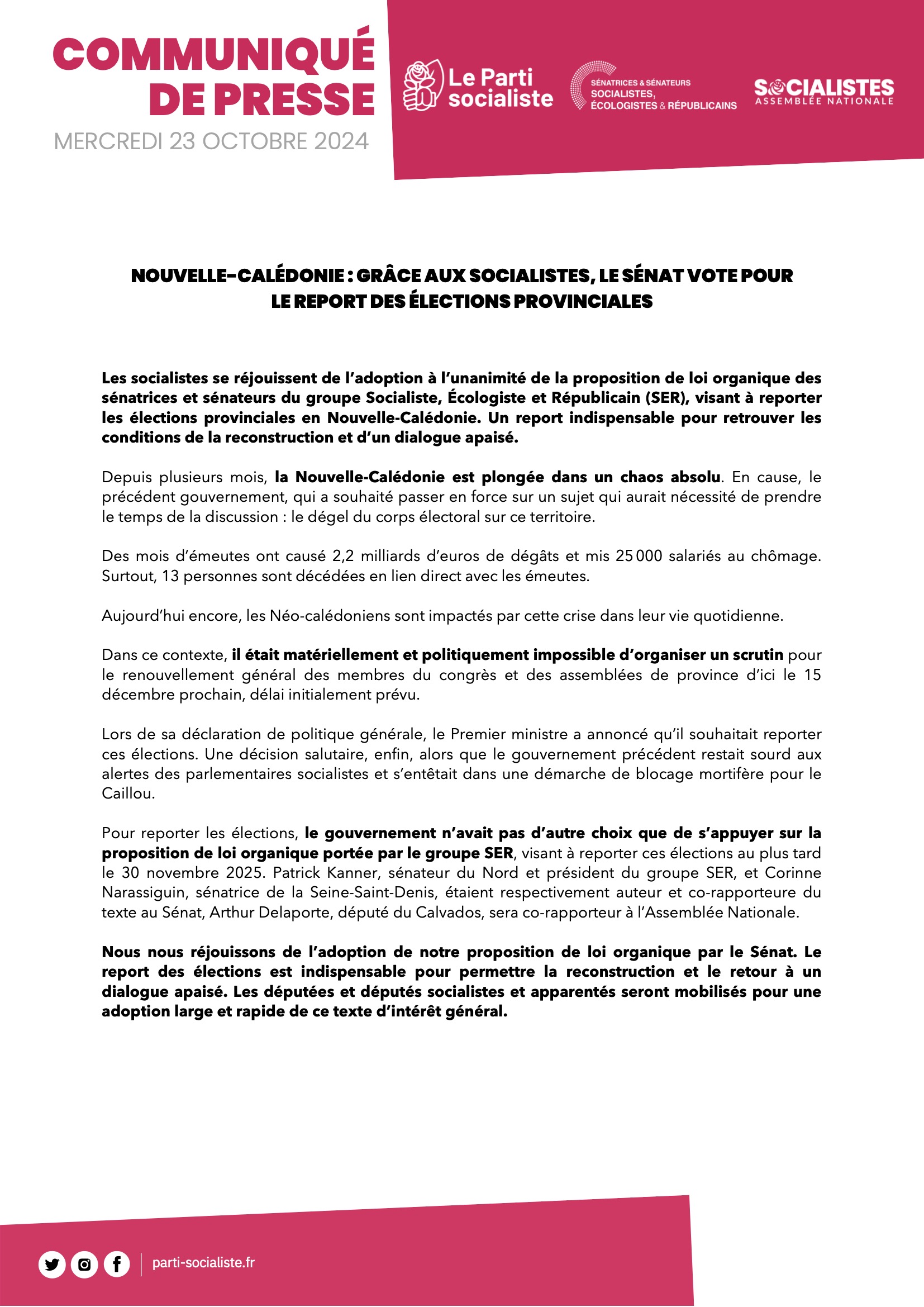 Les socialistes saluent l’adoption unanime au Sénat de leur proposition de loi pour reporter les élections provinciales en Nouvelle-Calédonie, afin de favoriser la reconstruction et un dialogue apaisé après des mois de crise. Ce report, jugé indispensable, vise à répondre aux conséquences graves des récentes émeutes et au blocage laissé par le gouvernement précédent.