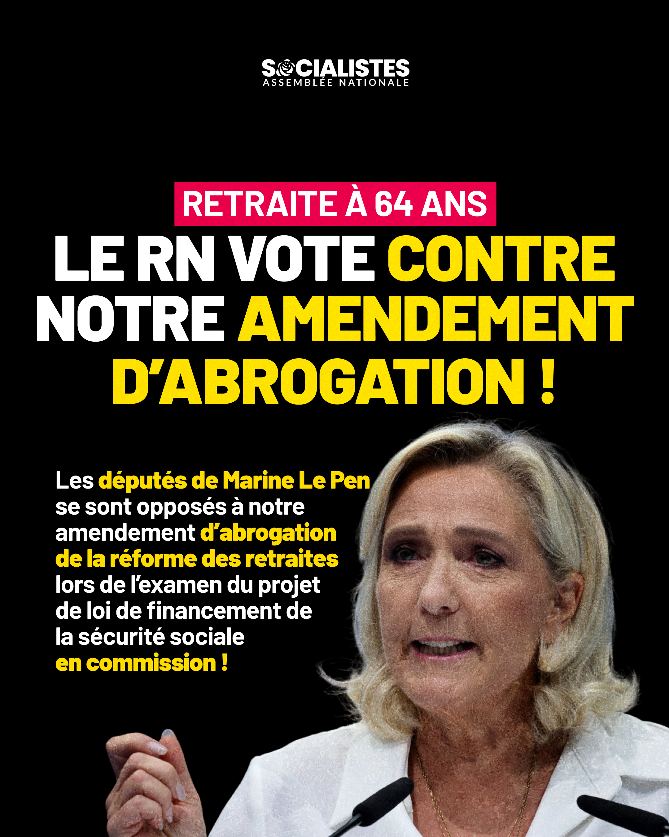 L’hypocrisie du RN s’est aussi exprimée lors de l’examen en commission du budget de la sécurité sociale : ses député·e·s ont voté contre notre amendement d’abrogation de la réforme des retraites !
