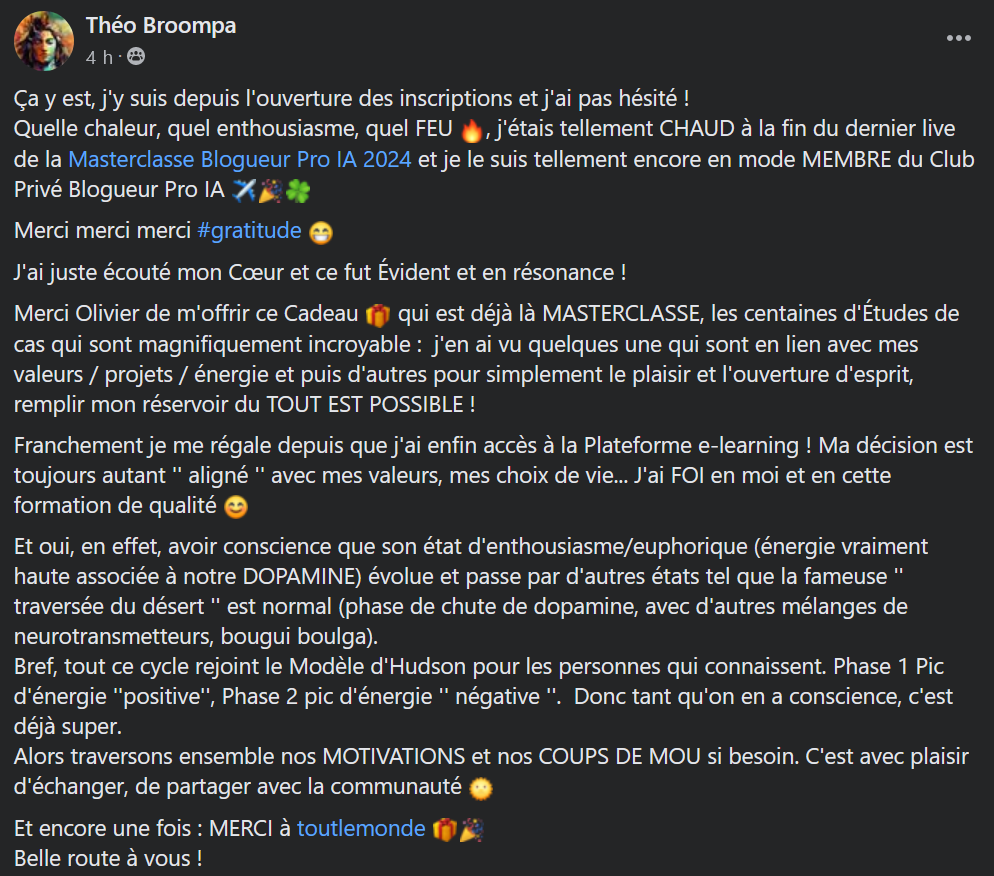 Dans la formation Blogueur Pro IA, nous allons beaucoup, beaucoup plus loin que dans la 3ème partie du livre : je vous enseigne comment créer et développer un business web au service de votre vie, et surtout je vous y emmène pas-à-pas, en vous montrant exactement comment faire à chaque étape.