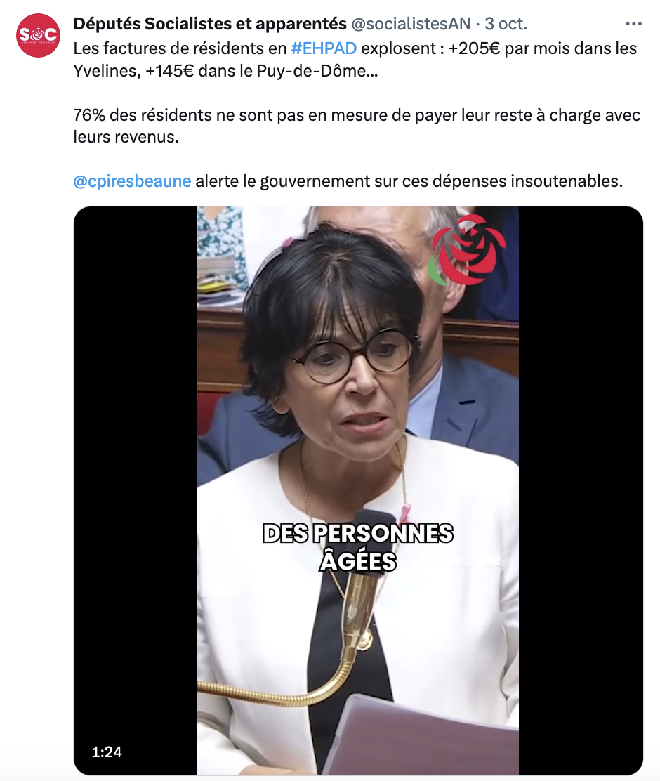 Mardi, lors de la séance de questions au gouvernement, Christine Pirès Beaune a interrogé Aurore Bergé sur la situation des résidents en EHPAD qui voient leurs factures exploser.