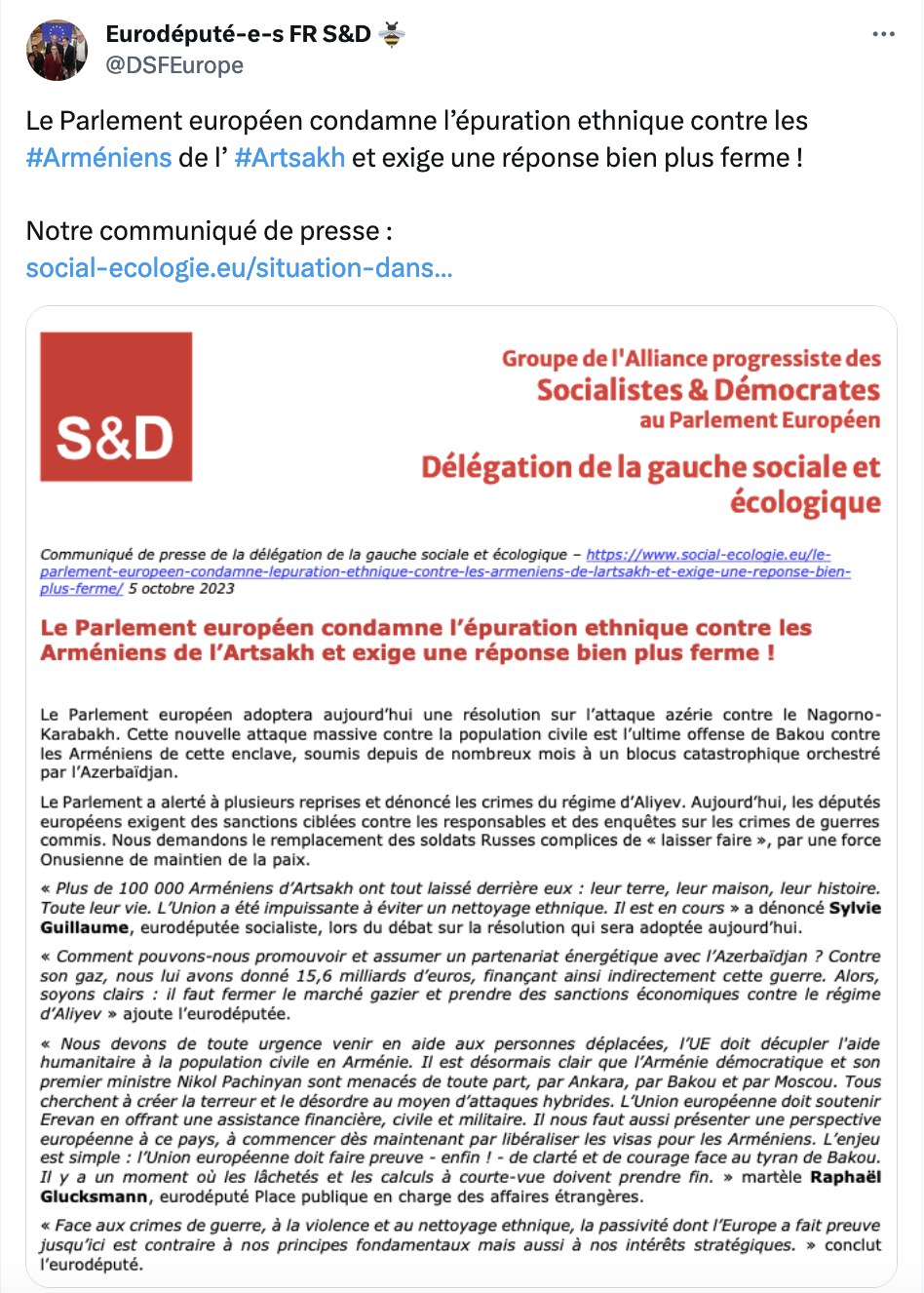 La délégation de la gauche sociale et écologique au Parlement européen a également dénoncé l’épuration ethnique contre les Arméniens de l’Artsakh et demande une réponse ferme de la part de l’Europe pour mettre fin à ces agissements.
