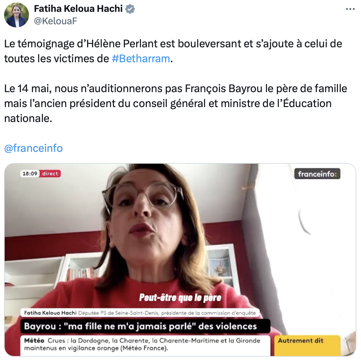 Fatiha Keloua Hachi, députée de la Seine-Saint-Denis et présidente de la commission d’enquête, fait sur le point sur les témoignages recueillis et sur l’audition de François Bayrou qui se tiendra le 14 mai.
