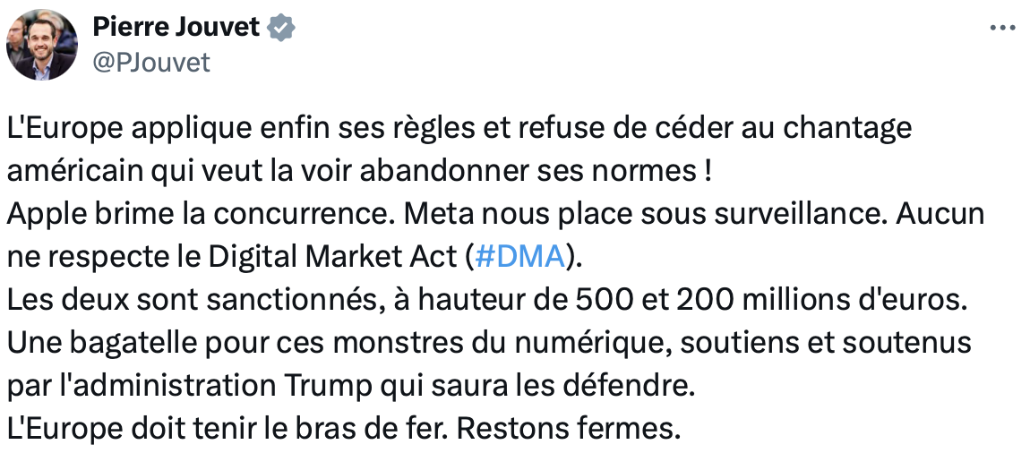 Le passage à l’offensive de l’administration Trump, depuis, a dévoilé l’agenda politique des Big Tech américaines : faire cesser l’application de la législation sur les services numériques – le DSA – celle sur les marchés numériques – le DMA – sans oublier celle sur l’Intelligence artificielle – car elle freinerait l’innovation. C’est l’ensemble des règles européennes établies pour réguler les grandes plateformes du numérique qui sont attaquées. »