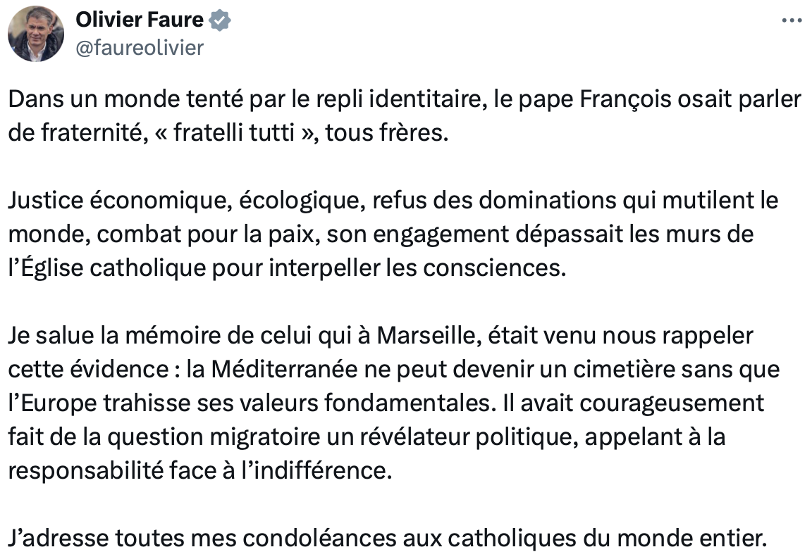 🇫🇷 Réaction du Parti socialiste à la mise en berne des drapeaux lors des obsèques du Pape François