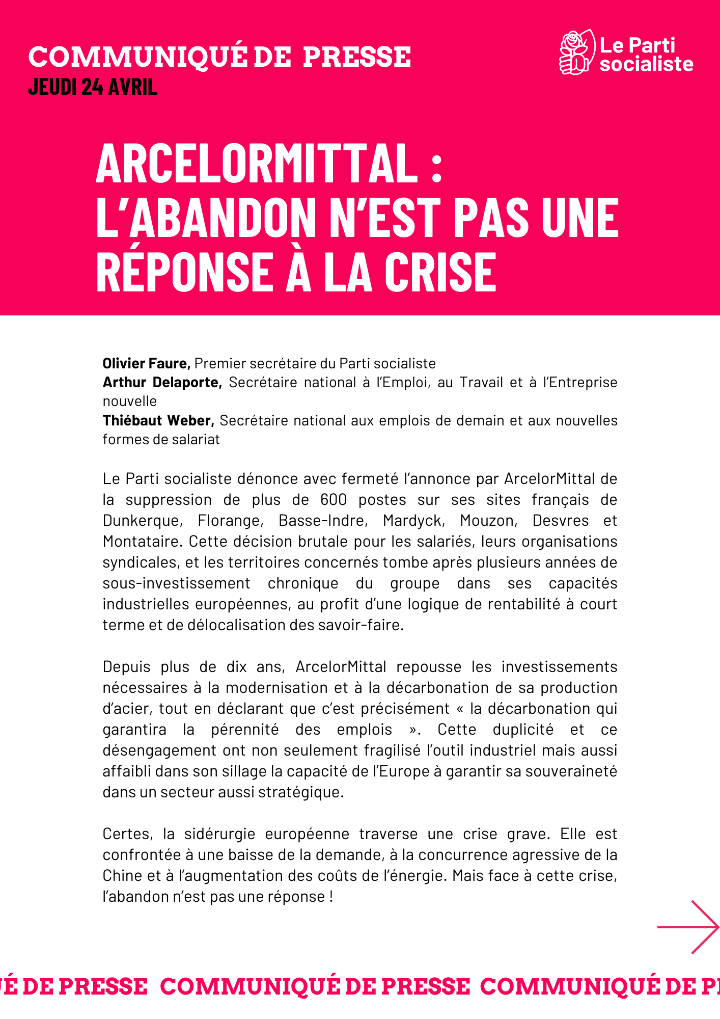 Ce jeudi, l’entreprise sidérurgiste ArcelorMittal a annoncé la suppression de 600 postes à travers la France. Une décision brutale qui résulte d’années de sous-investissements et de délocalisation, que nous dénonçons fermement.