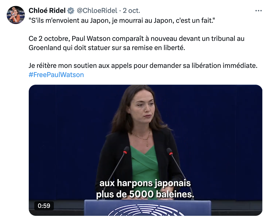 Comme l’a rappelé Chloé Ridel au Parlement européen : il faut libérer Paul Watson !