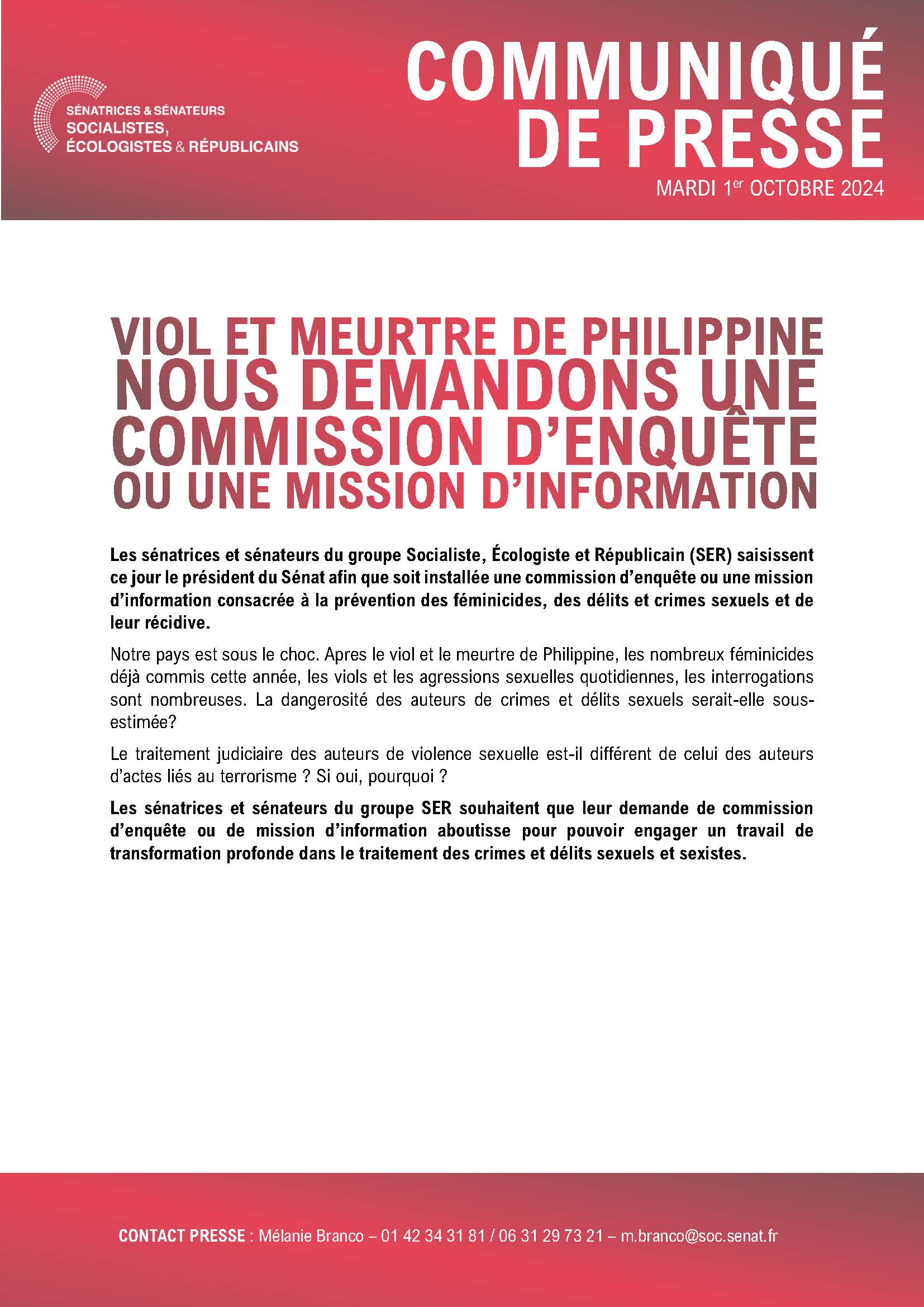 Les sénatrices et sénateurs du groupe Socialiste, Écologiste et Républicain (SER) demandent la création d’une commission d’enquête ou d’une mission d’information sur la prévention des féminicides, des crimes et délits sexuels, ainsi que leur récidive.