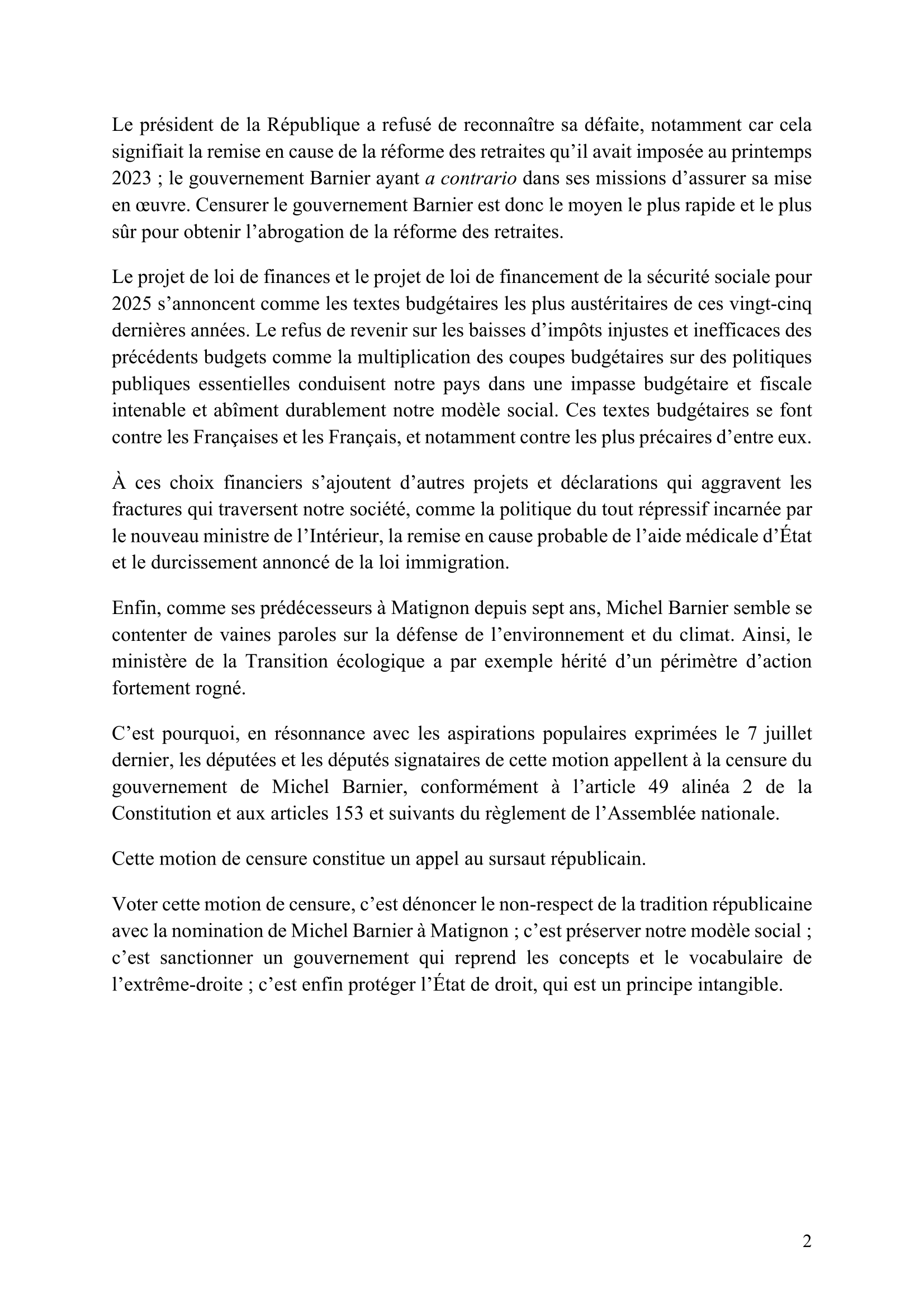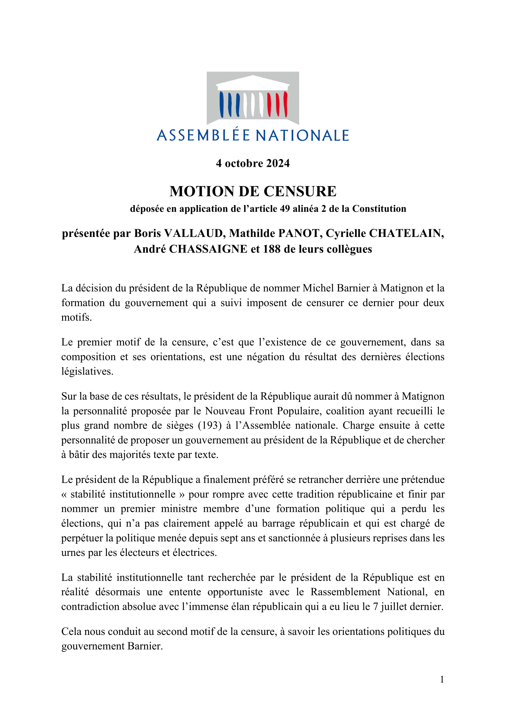 Nous déposons une motion de censure contre le Gouvernement Barnier !