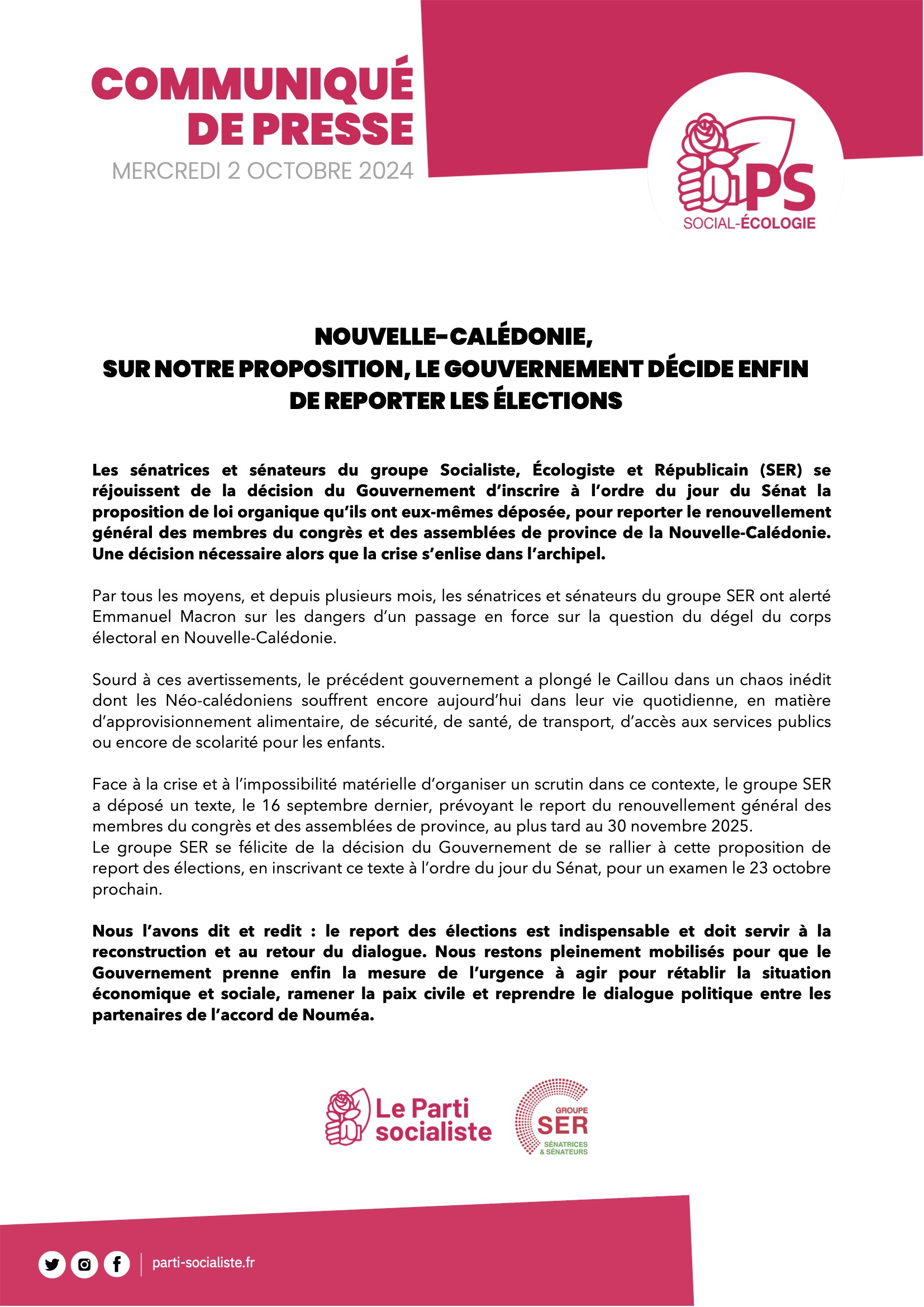 Les sénatrices et sénateurs du groupe Socialiste, Écologiste et Républicain se réjouissent que le Gouvernement ait accepté d’inscrire à l’ordre du jour du Sénat leur proposition de loi visant à reporter les élections en Nouvelle-Calédonie, en raison de la crise persistante dans l’archipel.