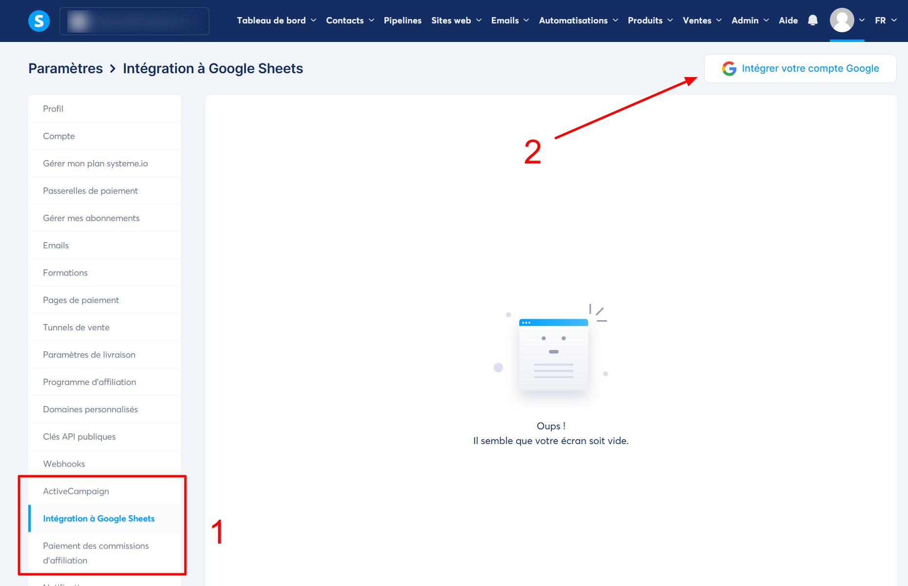 - Dans les “Paramètres” cliquez sur “Intégration Google Sheets”