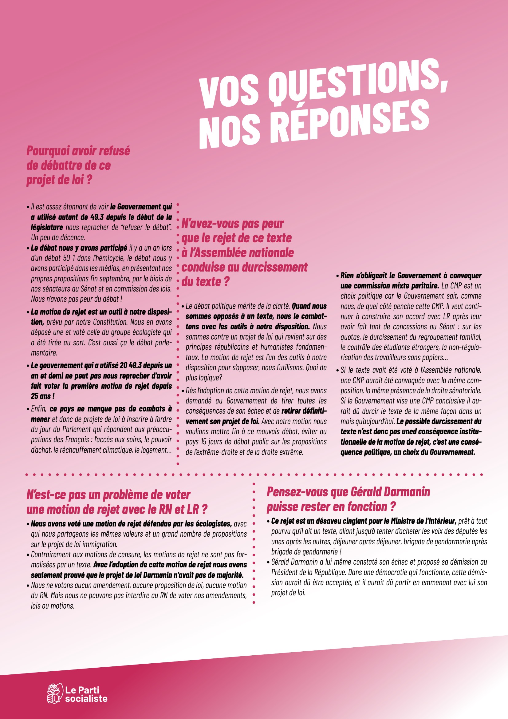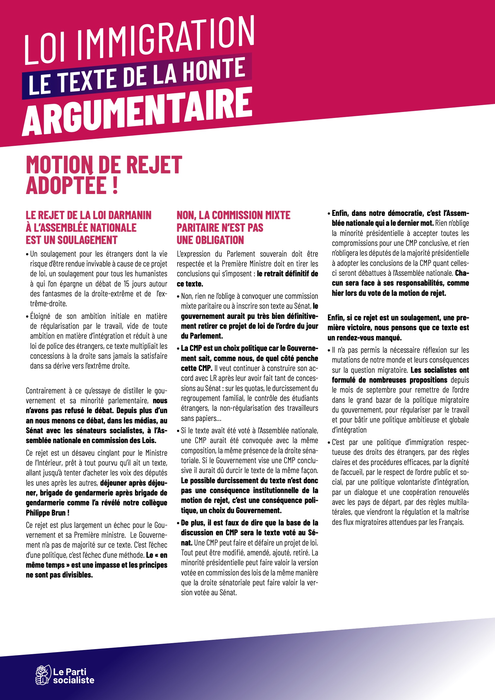 Comme vous le savez, la motion de rejet du projet de loi immigration a été votée hier. C’est une victoire politique sur le Gouvernement mais le combat contre ce texte…