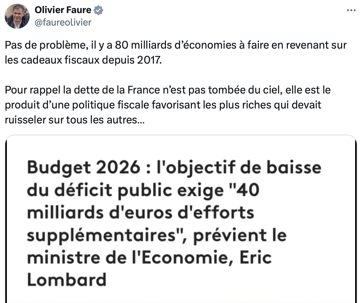 « Moi je veux savoir où on prend ces 40 milliards. Si c’est sur la fraude fiscale ou sociale, les marges, les cadeaux fiscaux : la réponse est oui. Si c’est sur l’école, sur les retraités, sur les services publics, la réponse sera la censure, évidemment. »
