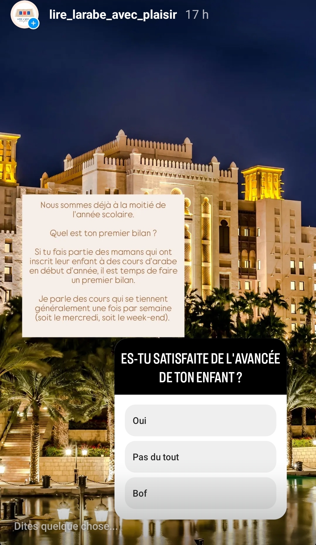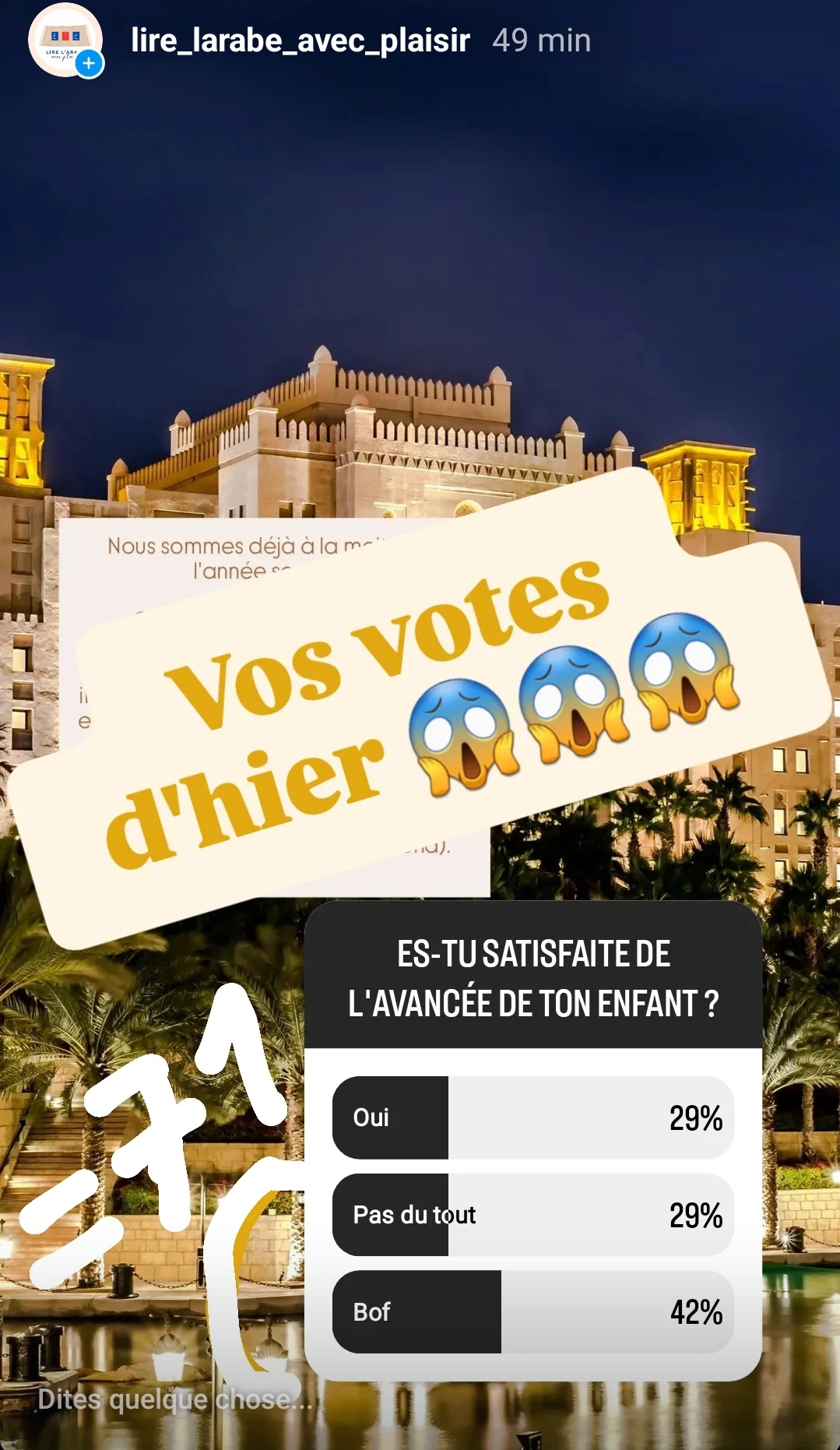 Donc en rĂ©sumĂ©, 71% (29+42… tu as vu comme je suis forte en maths đ) ne sont pas satisfaites de l’avancĂ©e actuelle de leur enfant en arabe !!!