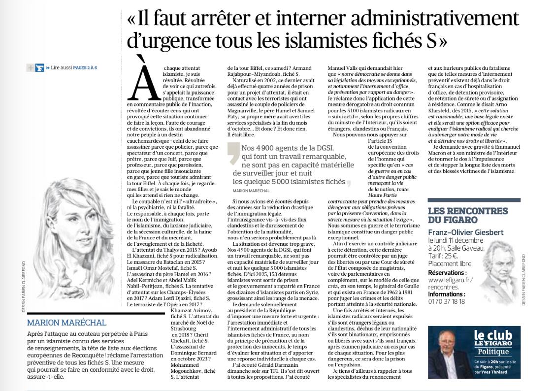 Dans une tribune publiée dans Le Figaro, j’ai demandé au Président de la République d’arrêter et d’interner administrativement d’urgence les 5000 islamistes fichés S. C’est la seule mesure courageuse qui permette réellement de mettre hors d’état de nuire des bombes humaines à retardement qui se baladent dans nos rues, en toute liberté.