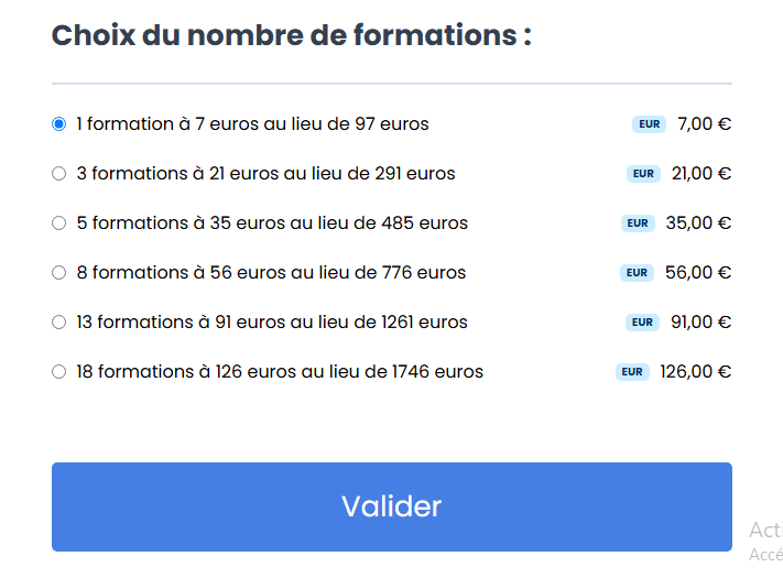 Sélectionne l’option que tu veux (1, 3, 5, 8, 13 ou 18 formations), comme sur l’image ci-dessous, et clique sur « Valider » pour commander