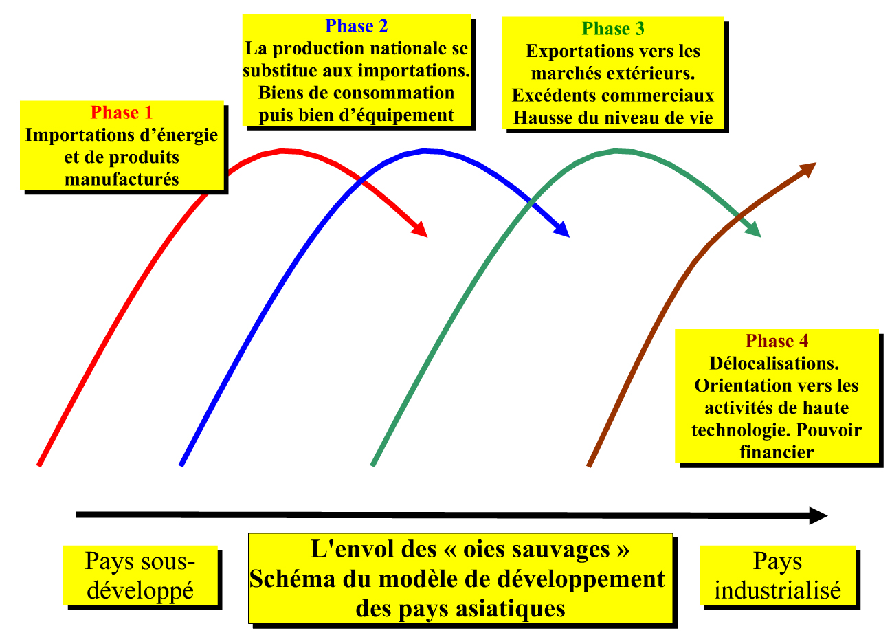Le nom de cette stratégie est inspiré du modèle du “vol des oies sauvages” utilisé pour décrire le développement économique en Asie de l’est au cours du 20ème siècle :