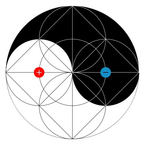 Le Yin Yang est une figure de tracé géométrique inscrite à l’intérieur d’un cercle. Sur un diamètre de celui-ci, on trace deux nouveaux cercles, qui sont internes et dont le diamètre respectif est égal au rayon du cercle qui les contient.