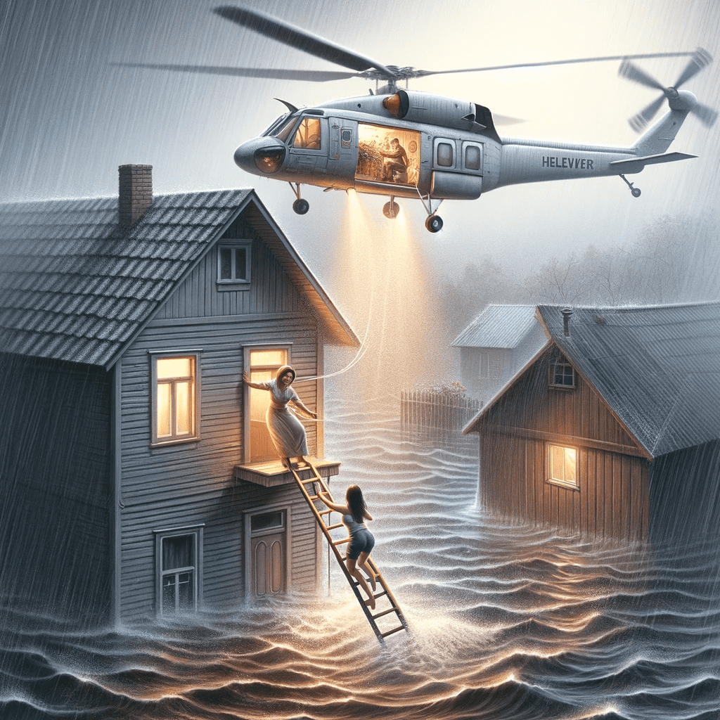 L’eau monte jusqu’à son cou, et un hélicoptère survient.