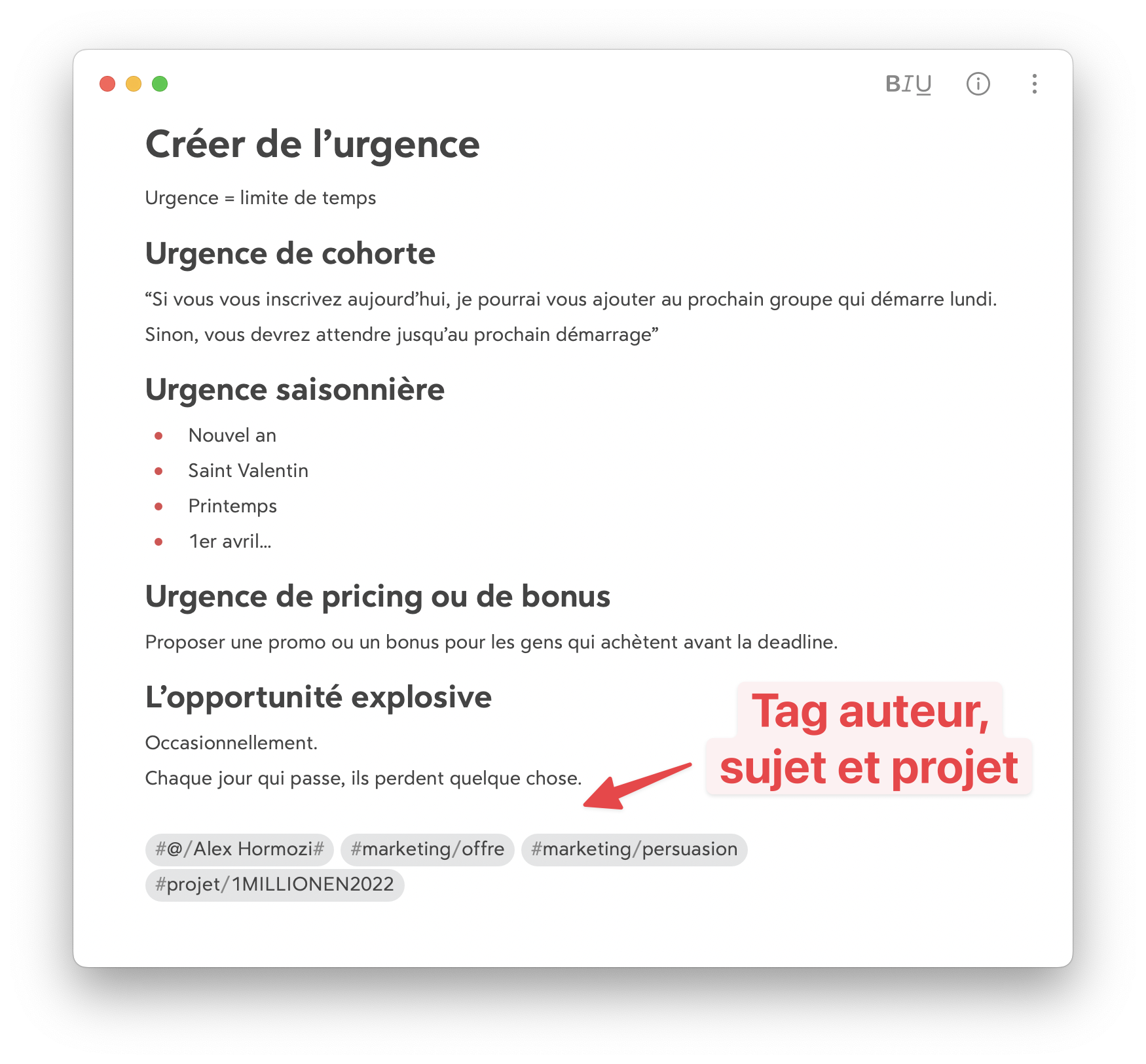Le tag sujet me permet de ranger la note avec toutes les autres notes qui en parle (ici, c’est le sous-tag « offre » qui est contenu dans le tag « marketing »)
