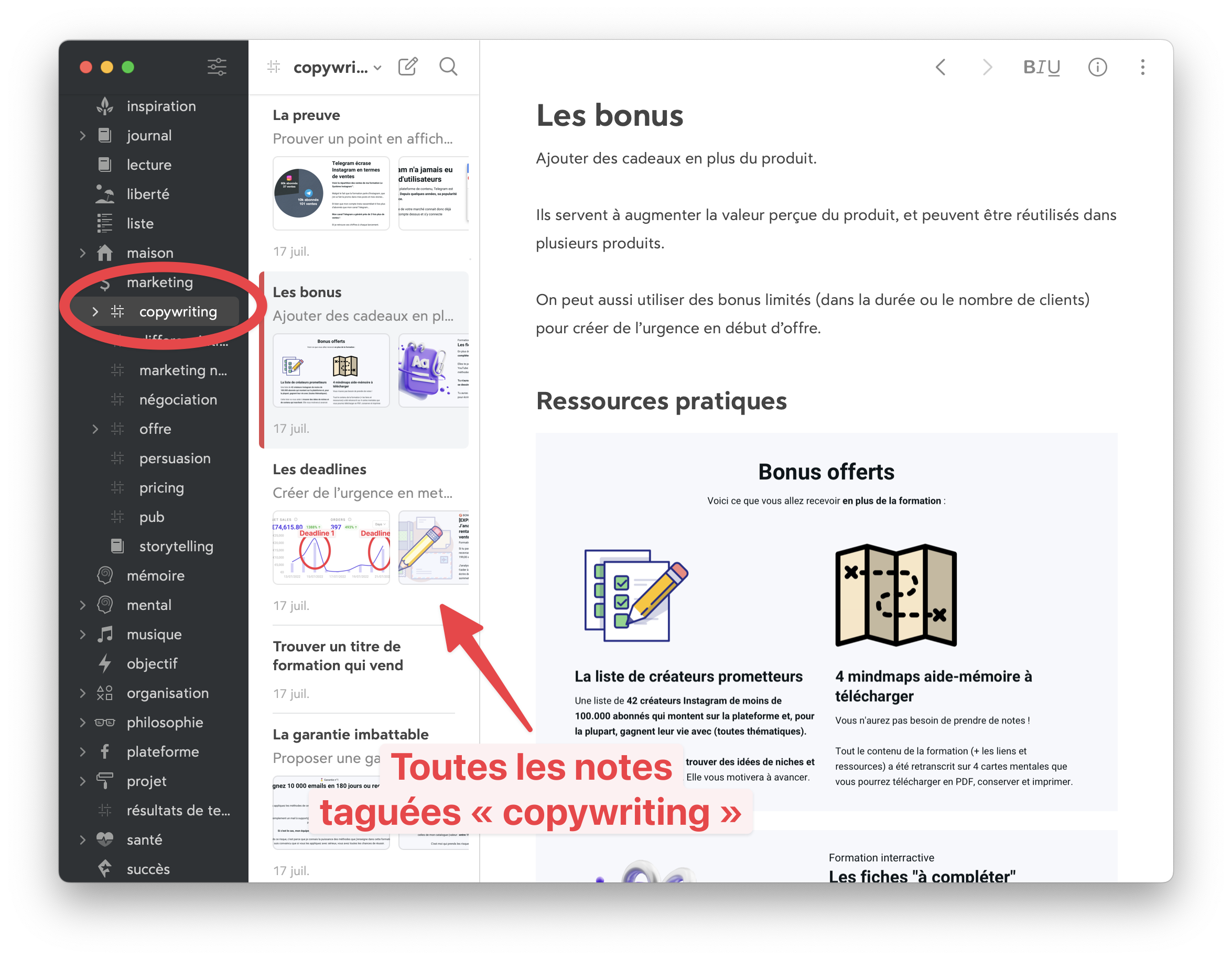 Si je crée une formation sur le copywriting, je peux aussi ouvrir le tag, et construire ma formation à partir des dizaines de notes qu’il contient.