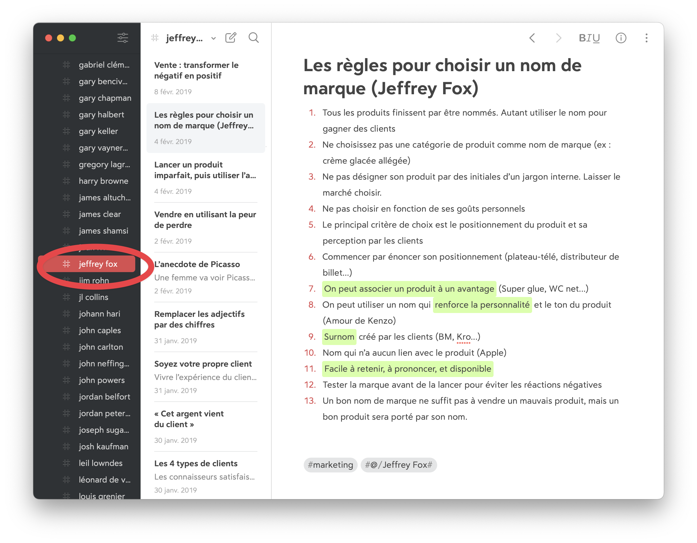Par exemple, si je note une idée intéressante dans une vidéo de Casey Neistat, je vais la taguer du nom de l’auteur.