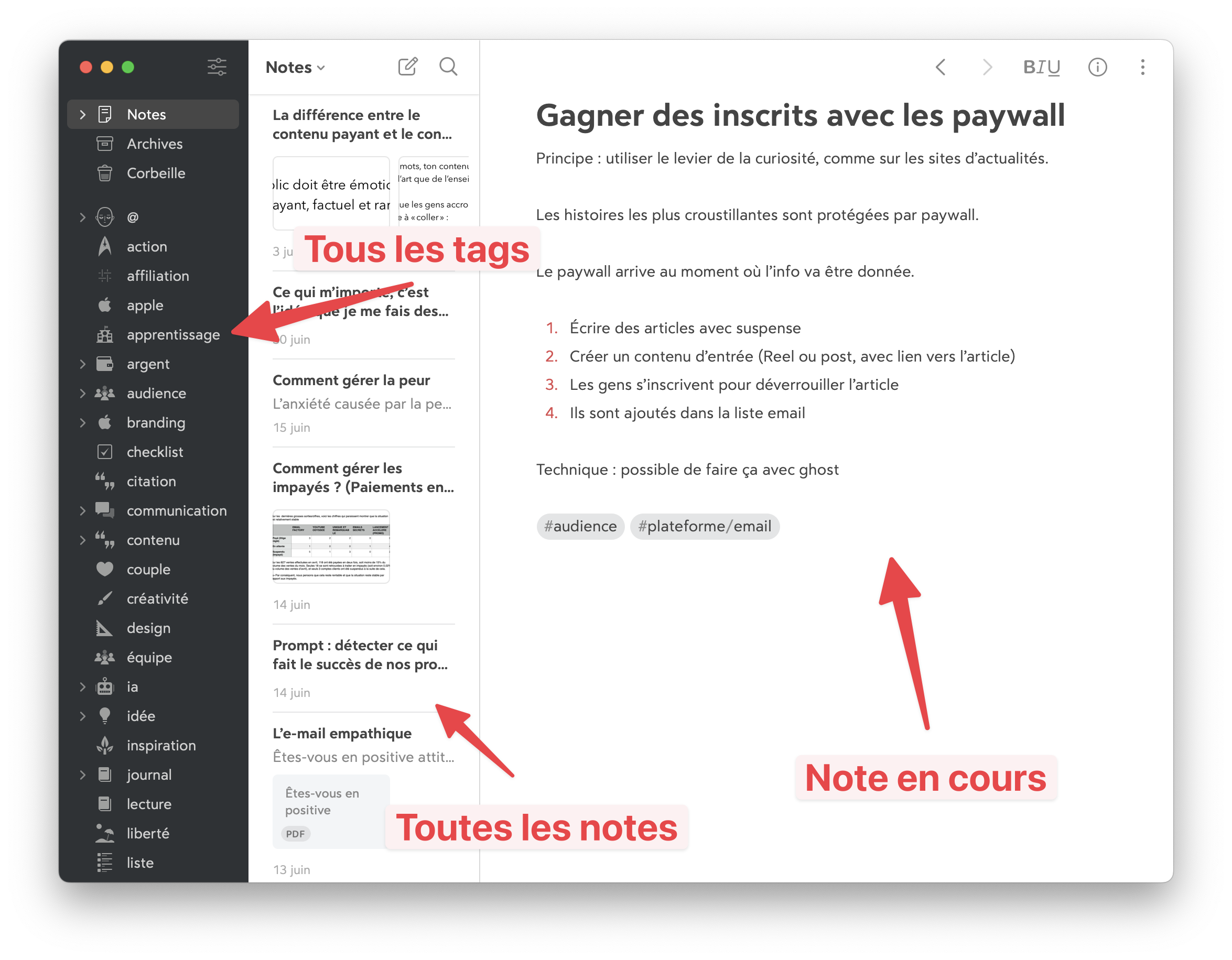 À gauche, tous mes tags. Je les utilise pour ranger mes notes, les organiser et les retrouver plus facilement.