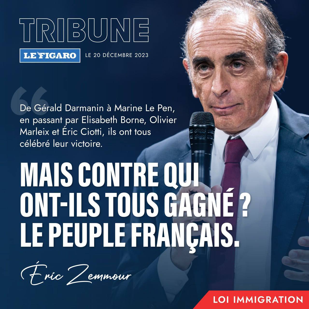 Dans ce contexte, quelle indécence de parler de victoire idéologique. Ces mesures signent au contraire une terrible défaite pour les Français. La classe politique ne parvient même pas à retarder ce qu’elle devrait empêcher : notre Grand Remplacement. Elle remet à plus tard la lutte contre l’immigration, elle durcit les mauvaises décisions prises par le passé, elle en invente de nouvelles tout aussi néfastes et, au passage, elle offre un cirque politique grotesque.