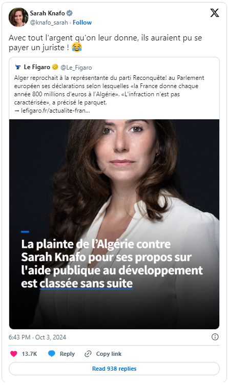 L’État algérien a tenté d’attaquer en justice Sarah Knafo, députée Reconquête au Parlement européen. Ils remettaient en cause ses déclarations selon lesquelles la France a donné plus de 800 millions d’euros à l’Algérie.