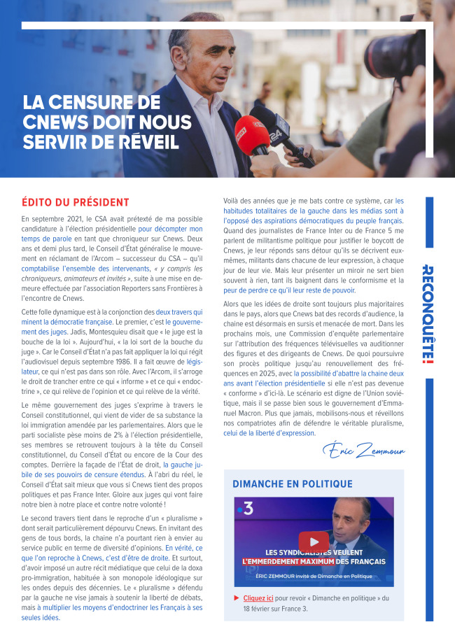 Merci encore pour vos retours positifs, vous pouvez continuer à nous faire part de vos impressions sur la boite mail : contact@parti-reconquete.fr