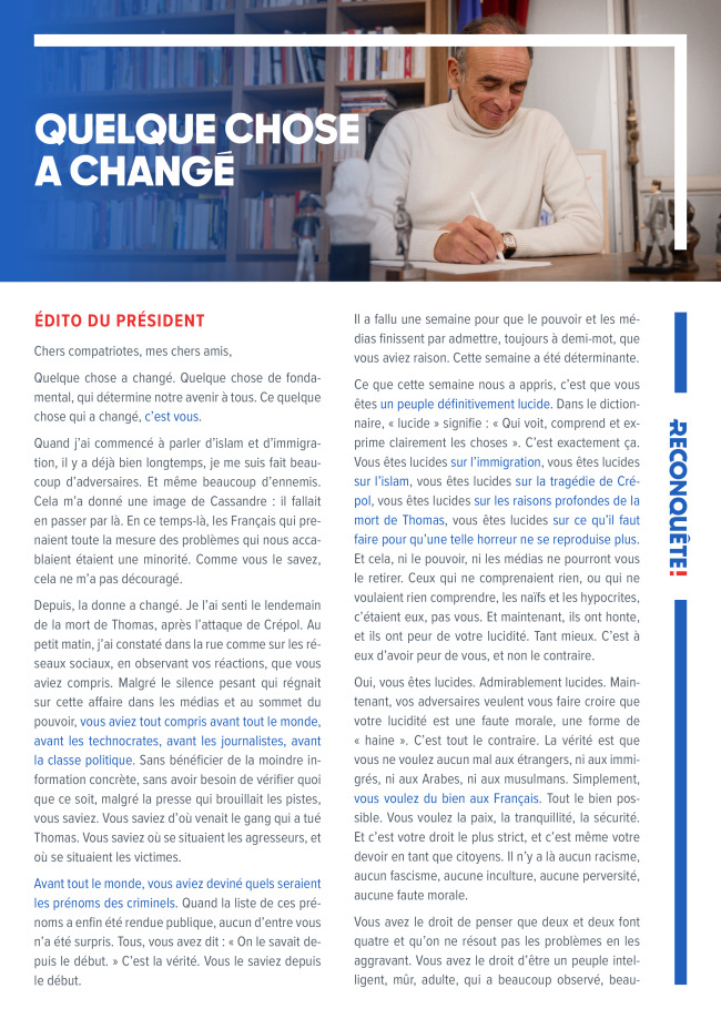 Merci encore pour vos retours positifs, vous pouvez continuer à nous faire part de vos impressions sur la boite mail : contact@parti-reconquete.fr