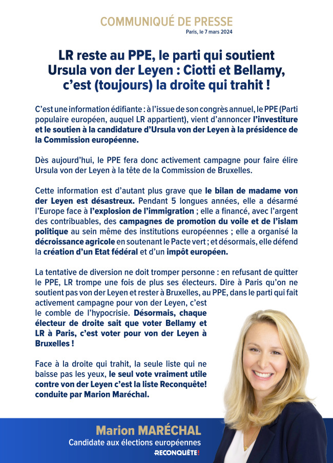 Face à la droite qui trahit, la seule liste qui ne baisse pas les yeux, le seul vote vraiment utile contre von der Leyen c’est la liste Reconquête! conduite par Marion Maréchal.