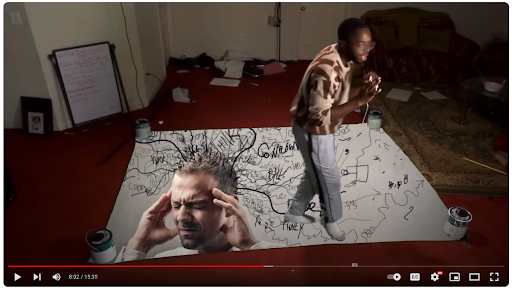 La vidéo alterne entre différents plans atypiques : David affalé dans un canapé, assis par terre, et la contreplongée de son salon avec le fond vert que je vous ai mis juste au dessus.