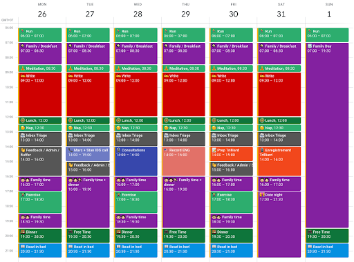 Bref, les seuls rendez-vous vraiment fixes sont 1 à 2 appels (selon les semaines) le mardi, l’enregistrement du Trilliard le samedi après midi et un dîner avec ma femme le samedi soir.