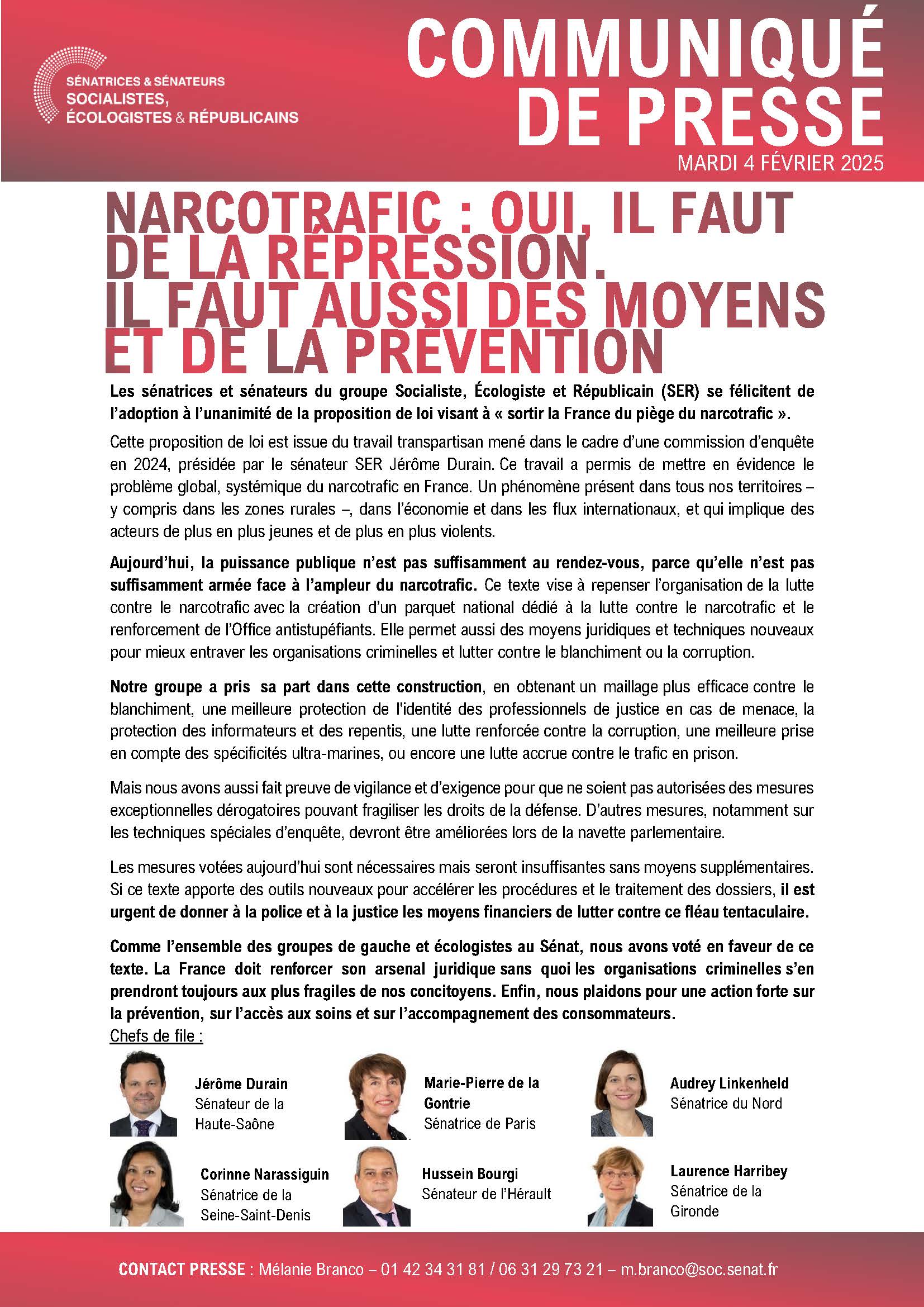 Adoption à l’unanimité au Sénat de la proposition de loi pour « sortir la France du piège du Narcotrafic » grâce au travail de Jérôme Durain, sénateur socialiste et président de la commission d’enquête qui précédait cette proposition de loi.