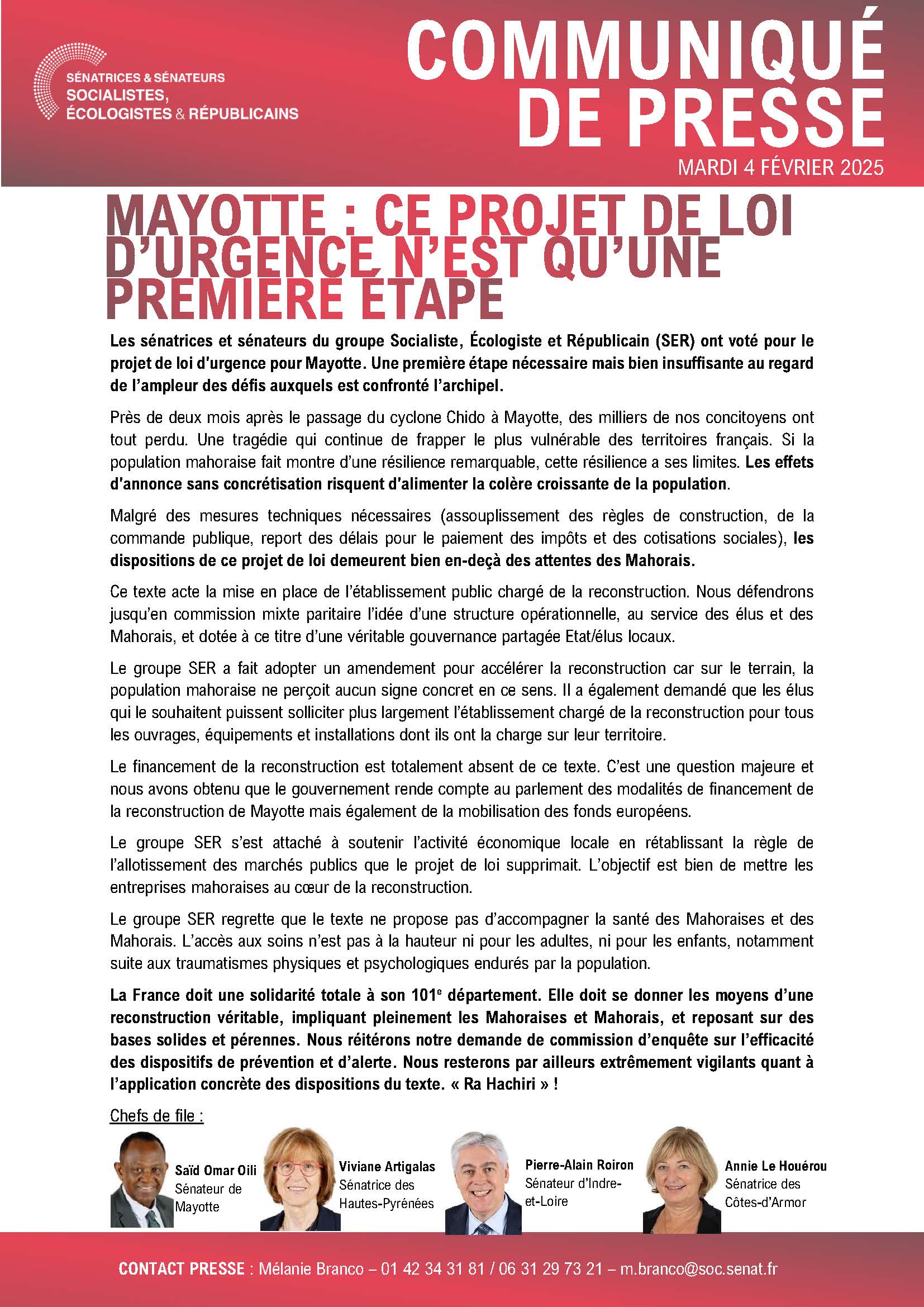 Le Sénat a adopté mardi soir, à l’unanimité, le projet de loi d’urgence pour la reconstruction de Mayotte. Les socialistes ont voté pour mais dénoncent un projet de loi insuffisant.