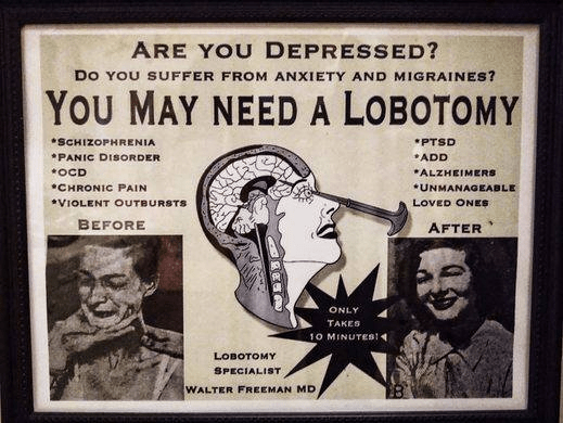Traduction : Êtes-vous déprimé ? Souffrez-vous d’anxiété ou de migraines ? Vous avez peut-être besoin d’une lobotomie Schizophrénie, trouble panique, OCD, douleurs chroniques, crises de violence, syndrome de stress post-traumatique, trouble de l’attention, Alzheimer, proches ingérables Ne prend que 10 minutes !