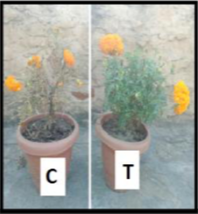 Image de Dorothy Retallack de plantes exposées à la musique pendant 4 semaines. À gauche une plante sans exposition, à droite celles traitées (T) avec de la musique positive.