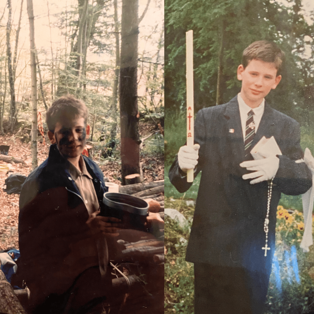 Photos d’archive : aux scouts étant enfant (une version paramilitaire du scoutisme…) et ma première communion, dans un groupuscule pseudo-catholique fondamentaliste.