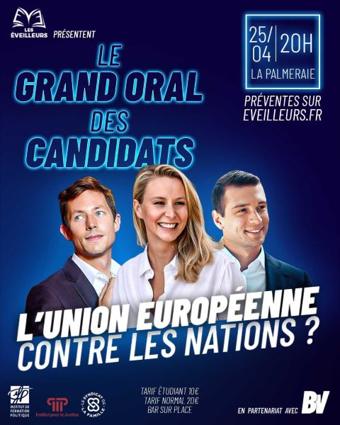 Ce jeudi 25 avril, à Paris, je participerai au grand oral des candidats organisé par les Éveilleurs en partenariat avec Boulevard Voltaire, l’Institut pour la Justice, le syndicat de la famille et l’Institut de formation politique.