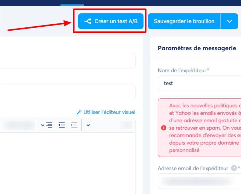 Cliquez sur « Créer un test A/B » pour accéder aux paramÚtres du test A/B