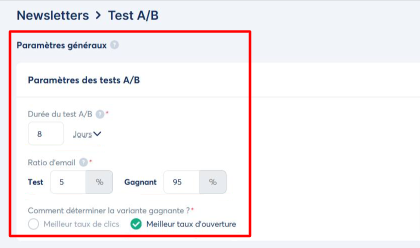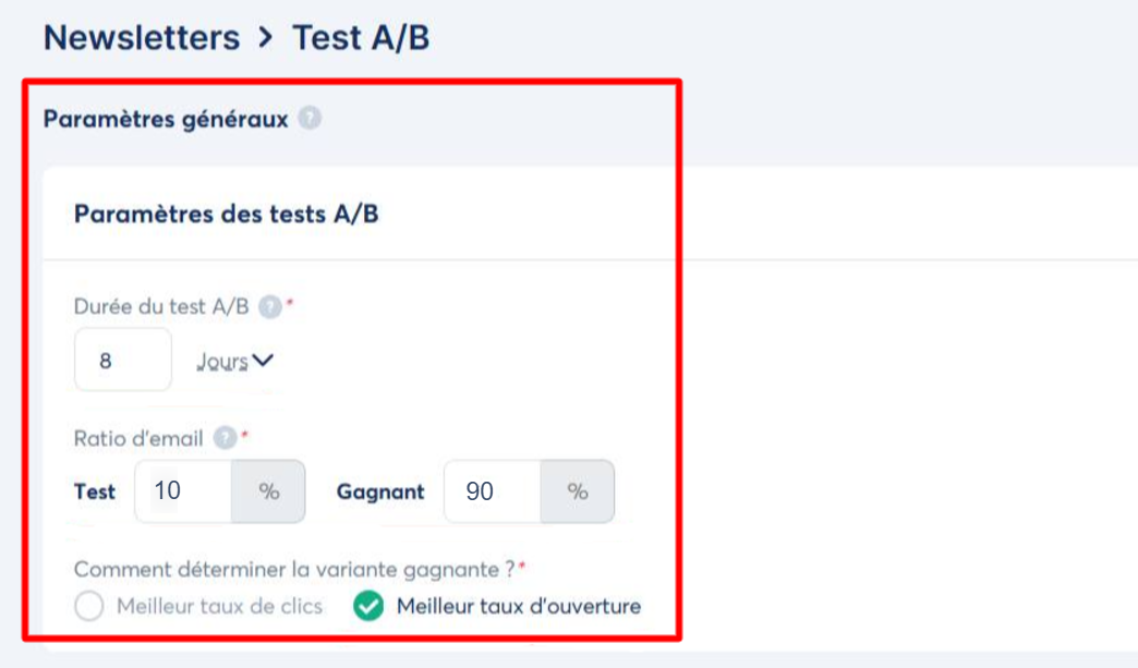 - Choisissez si le gagnant sera dĂ©terminĂ© par le meilleur taux de clics ou le meilleur taux d’ouverture