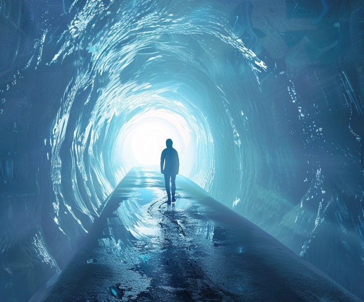 Fabienne se retrouve dans un espace lumineux et Martine se retrouve dans un tunnel de lumière aux formes indéfinissables.